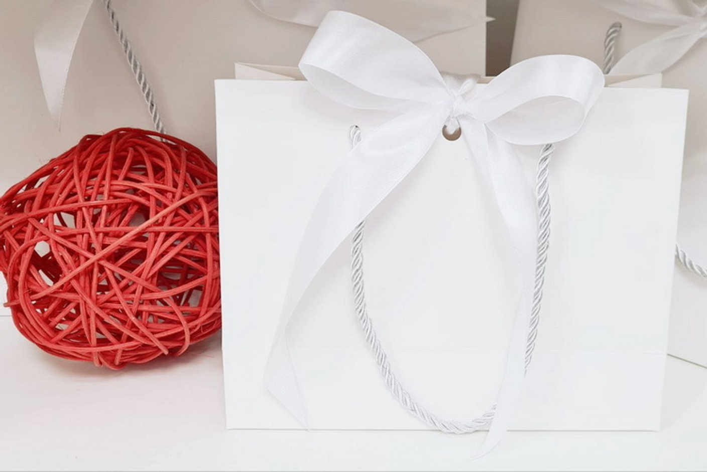 1. Подарочный бумажный пакет с лентой (цвет белый) Размеры Ш/В/Г: 15x14x7, 19x15x7, 23x18x10, 28x20x10 Плотный белый картон Серые (серебряные) крученые ручки Белоснежная атласная лента |