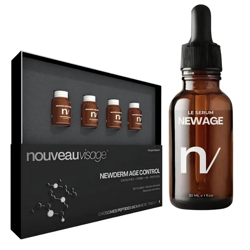 - Бустер с экзосомами Age Control Newderm Nouveau Visage глубоко проникает в кожу, уменьшая морщины и тонкие линии, а также повышая уровень увлажненности, упругости и эластичности кожи. Благодаря сочетанию полинуклеотидов и биомиметических пептидов он стимулирует восстановление клеток и выработку коллагена и эластина, необходимых для восстановления объема и молодости кожи. Эта процедура укрепляет кожу, разглаживает мелкие морщины, усиливает кожный барьер и улучшает микроциркуляцию, в результате чего кожа становится более упругой, увлажненной и сияющей.