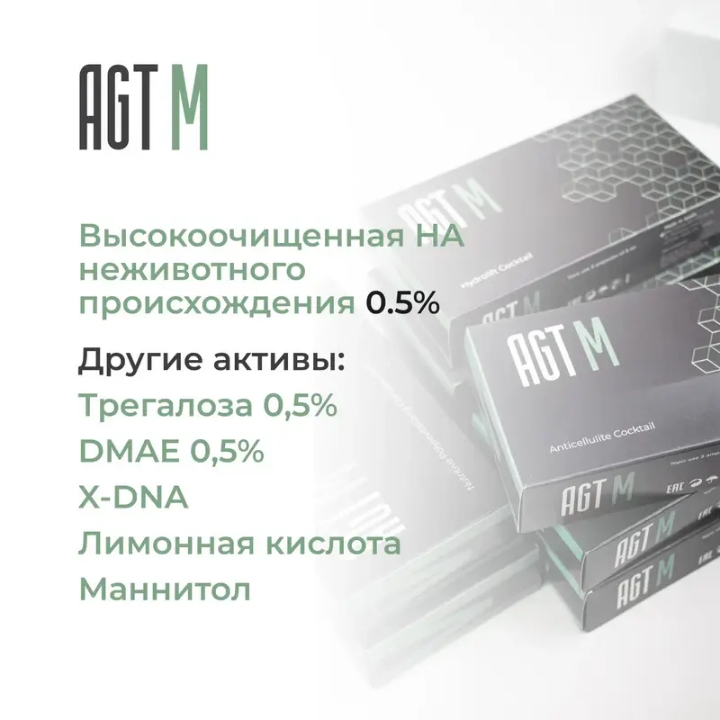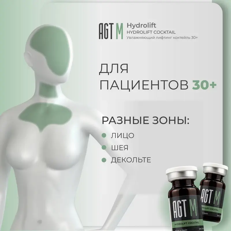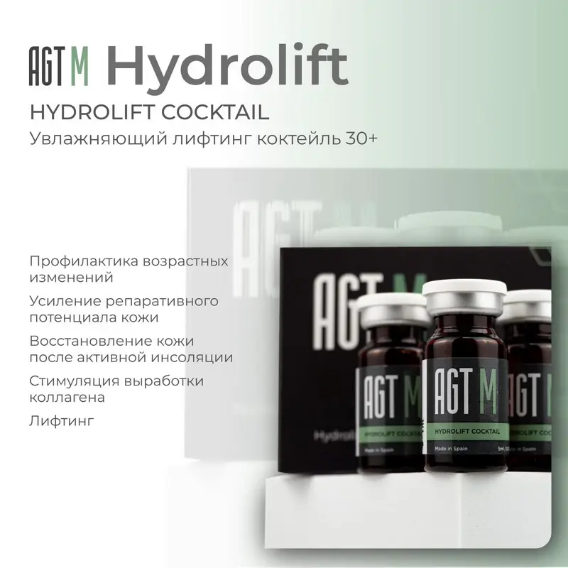 Hydrolift Coctail AGT М - мощный эффект лифтинга, восстанавливает упругость кожи, помогает восстановить упругость мышц на проблемном участке и сделать ткань более крепкой.