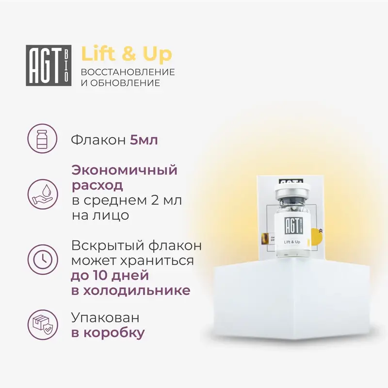 Lift & Up AGT Bio - предназначен для возрастной категории 35+ для формирования лифтинга кожи, восстанавливает дермальный матрикс, повышает иммунные свойства кожи, улучшает гидробаланс мягких тканей, борется с морщинами, восстанавливает рельефность кожи.