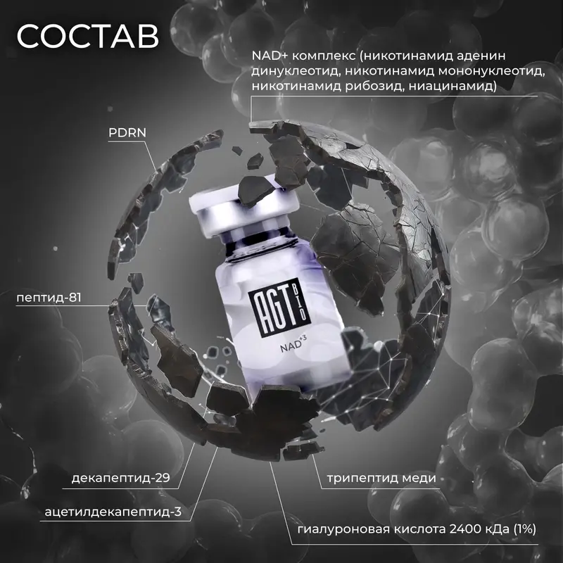 Хранить NAD+3 AGT Bio в сухом, тёмном месте при температуре +5°С до +25°С, не замораживать! После вскрытия флакона хранить не более 10 дней при температуре +5°С до +8°С.