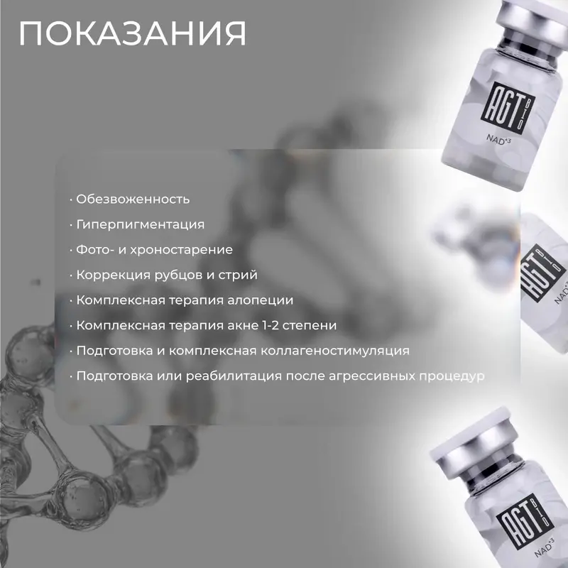 - Комплекс NAD+ оказывает стимулирующее действие на синтез клеточной энергии АТФ, основу жизнедеятельности любого организма, а также участвует в репарации и синтезе ДНК.