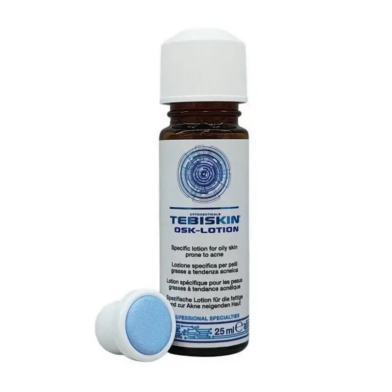 Osk Lotion Tebiskin - специализированный спиртосодержащий лосьон для жирной и проблемной кожи предотвращает накопление себума на поверхности кожи, очищает протоки сальных желез, уменьшает выраженность воспалительных элементов и предотвращает их появление в будущем. Несмотря на содержание спирта лосьон не сушит кожу.